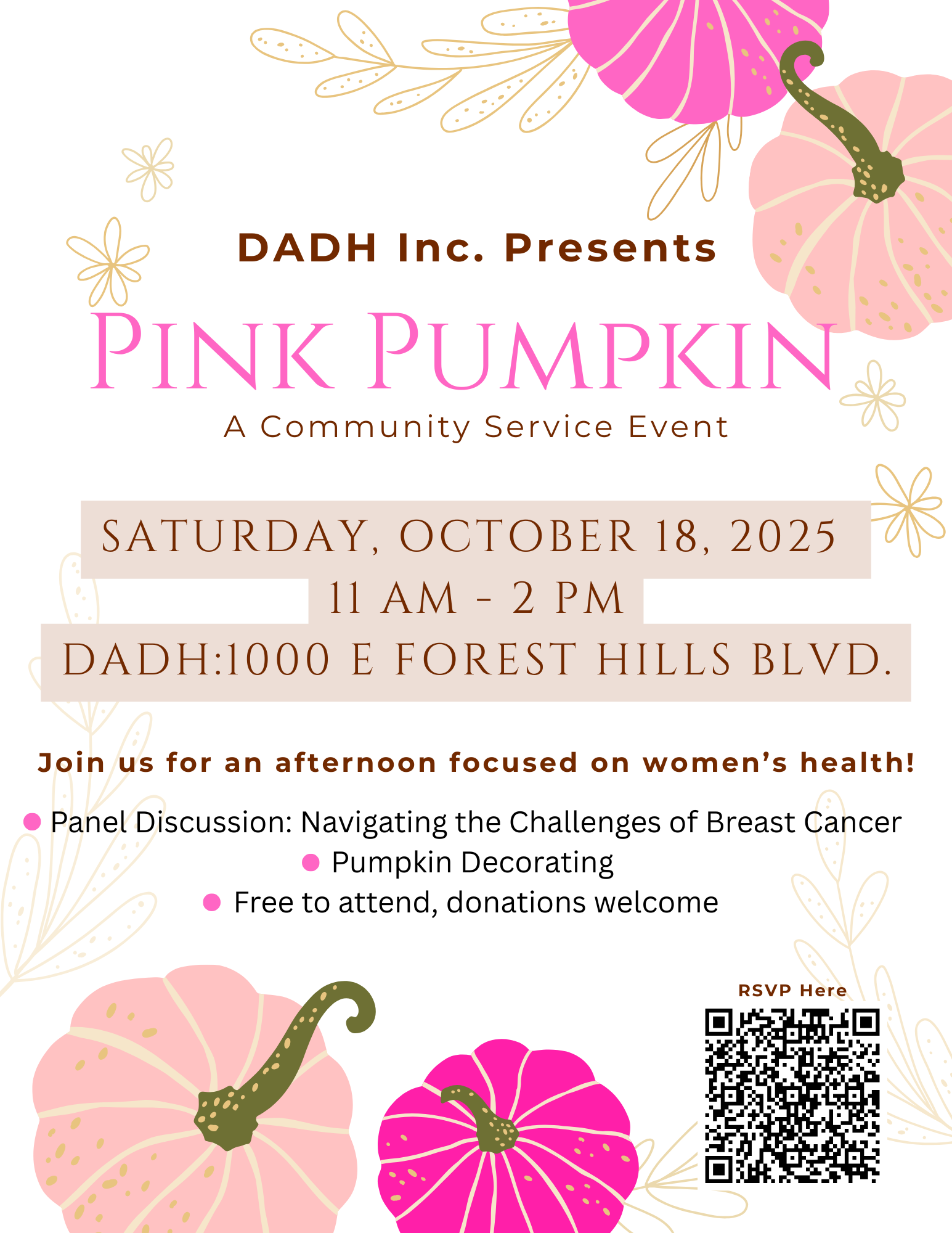 A community service event dedicated to women's health, Pink Pumpkin combines vital education with community engagement. Featuring panel discussions led by healthcare professionals and creative pumpkin decorating activities, this annual event empowers the African American community with critical information about early detection and breast cancer prevention.